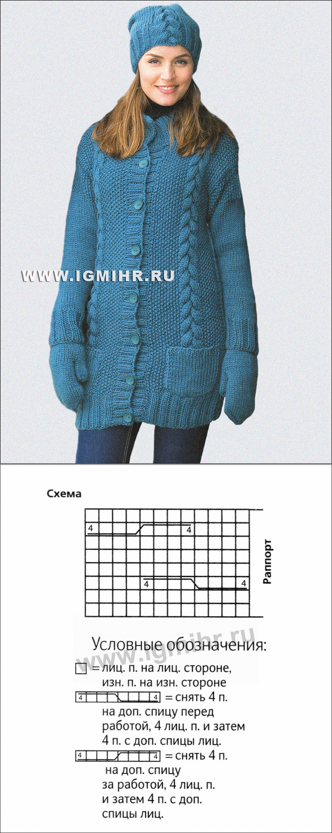 Теплый комплект цвета мурены: длинный жакет, шапочка и варежки. Спицы