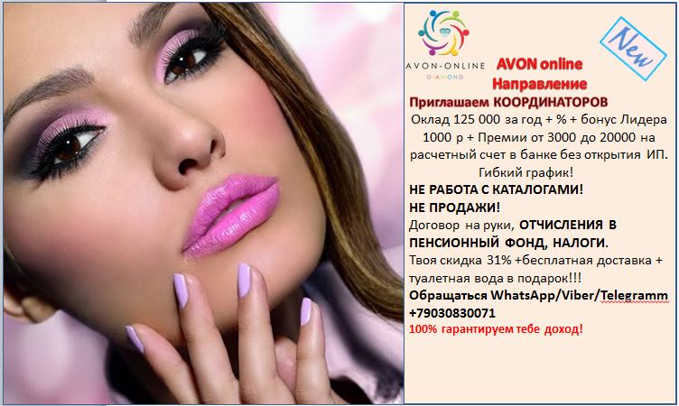 Вас интересует подработка на дому? В компанию Эйвон ведется набор координаторов. Работа только онлайн, в интернете. НЕ продажи, НЕ каталоги. Оплата без открытия ИП на карту Вашего банка. Договор, стаж, пенсионка. Все официально. От 18 лет. Только граждане РФ.
