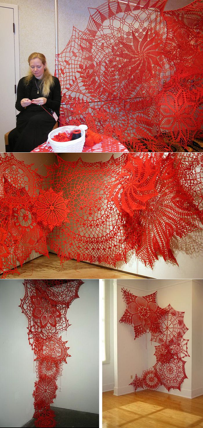 Красное кружево на стенах выставочного зала: гигантская вязаная инсталляция | Современное искусство | Арт