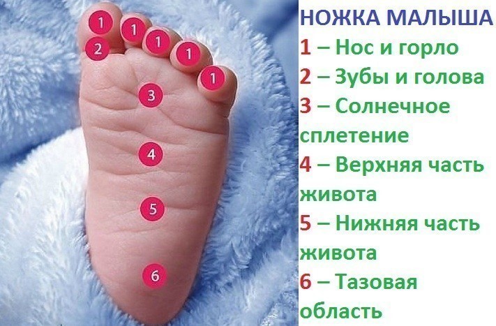 Ножка малыша Мягко массируя определенную зону на Ножка малыша Мягко массируя определенную зону на детской стопе, Вы успокоите своего малыша, если у него что-то болит: 1 – Нос и горло 2 – Зубы и голова 3 – Солнечное сплетение 4 – Верхняя часть живота 5 – Нижняя часть живота 6 – Тазовая область
