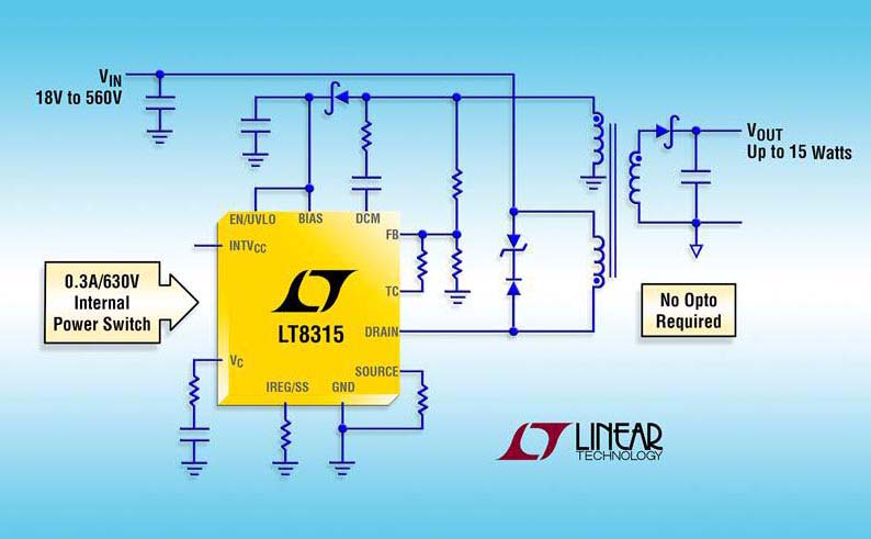 Linear Technology анонсирует 560-вольтовый микромощный обратноходовой регулятор напряжения LT8315 работает в диапазоне входных напряжений от 18 В до 560 В, содержит интегрированный силовой ключ 0.30 А/630 В и может отдавать мощность до 15 Вт. Микросхема работает в квазирезонансном режиме граничной проводимости, в котором перемененная частота переключающей схемы, управляемой по току трансформатора, обеспечивает нестабильность по нагрузке и входному напряжению лучше 1%. Граничный режим дает воз