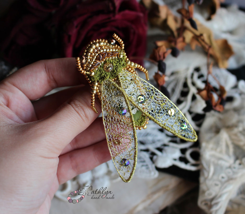 Брошь 'Золотая цикада' : вышивка бисером, сваровски, кружево Купить или заказать Брошь 'Золотая цикада' : вышивка бисером, сваровски, кружево в интернет-магазине на Ярмарке Мастеров. Брошь в виде фантазийной цикады с нежнейшими и невесомыми крылышками продолжает мою серию брошей-насекомых. Каркасные крылья созданы из винтажного тюля и расшиты металлизированным французским мулине и австрийскими кристаллами Swarovski, а брюшко украшено винтажным кружевом и бархатной лентой. ...