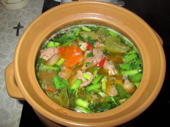 Дла рецепта взяла около 200 г баранины, по две госрти куриных желудков и сердечек, 4 большие морковки, 3 луковицы, один болгарский перец, 2 помидора, зелёный лук, петрушка, кориандр в зёрнах, соль, душистый перец, лавровый лист.