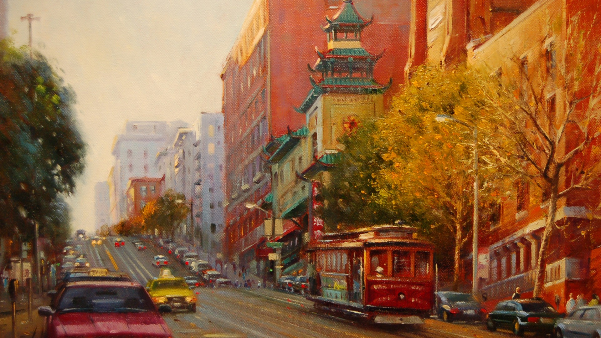 Скачать обои картина, арт, такси, вечер, трамвай, пагода, Po Pin Lin, осень, закат, раздел живопись в разрешении 1920x1080