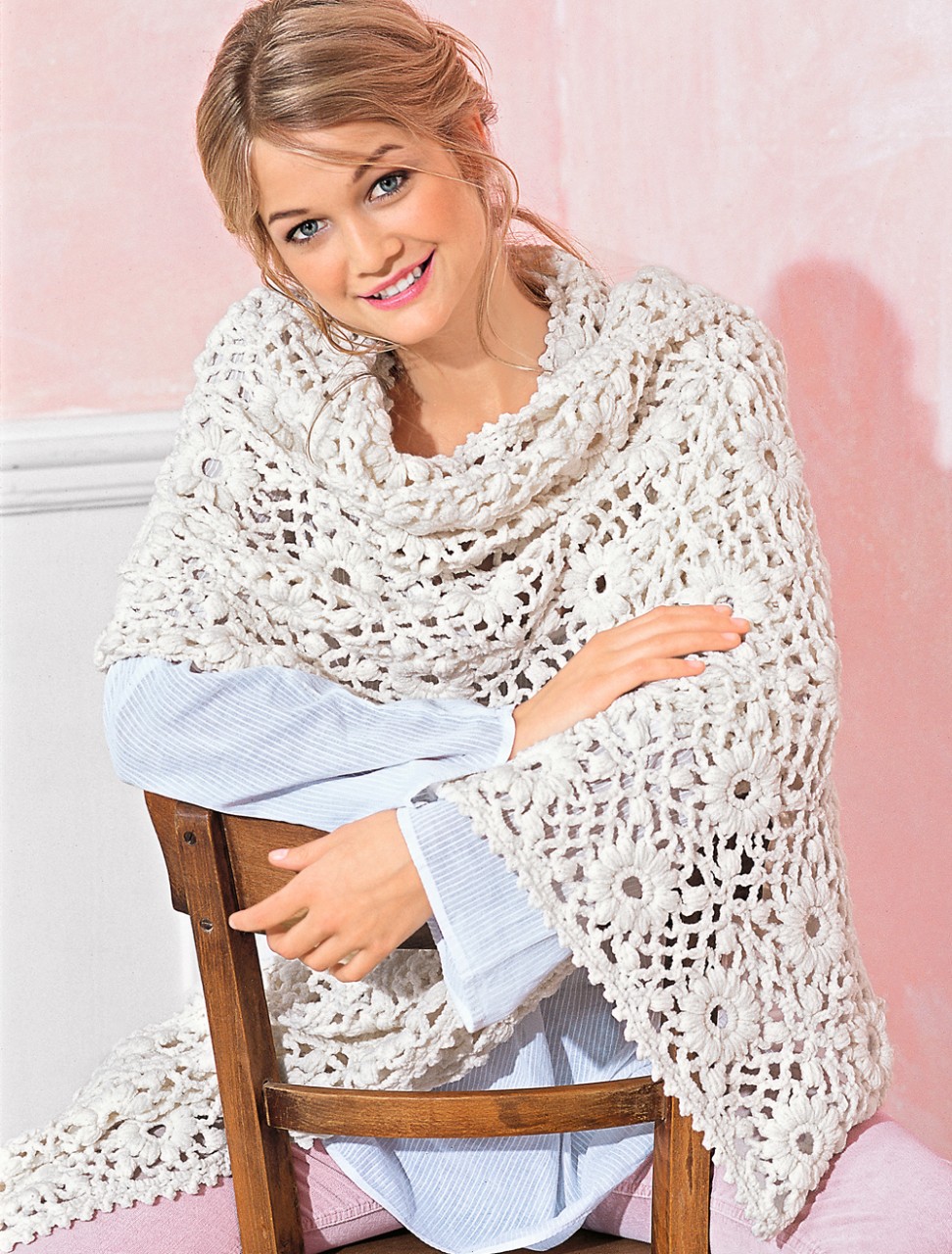 Ажурный палантин из мотивов крючком За счет того, что этот женственный и нежный палантин собран из мотивов, вы можете сделать его любой длины и ширины, просто прибавив или убавив ряды по вертикали или горизонтали.