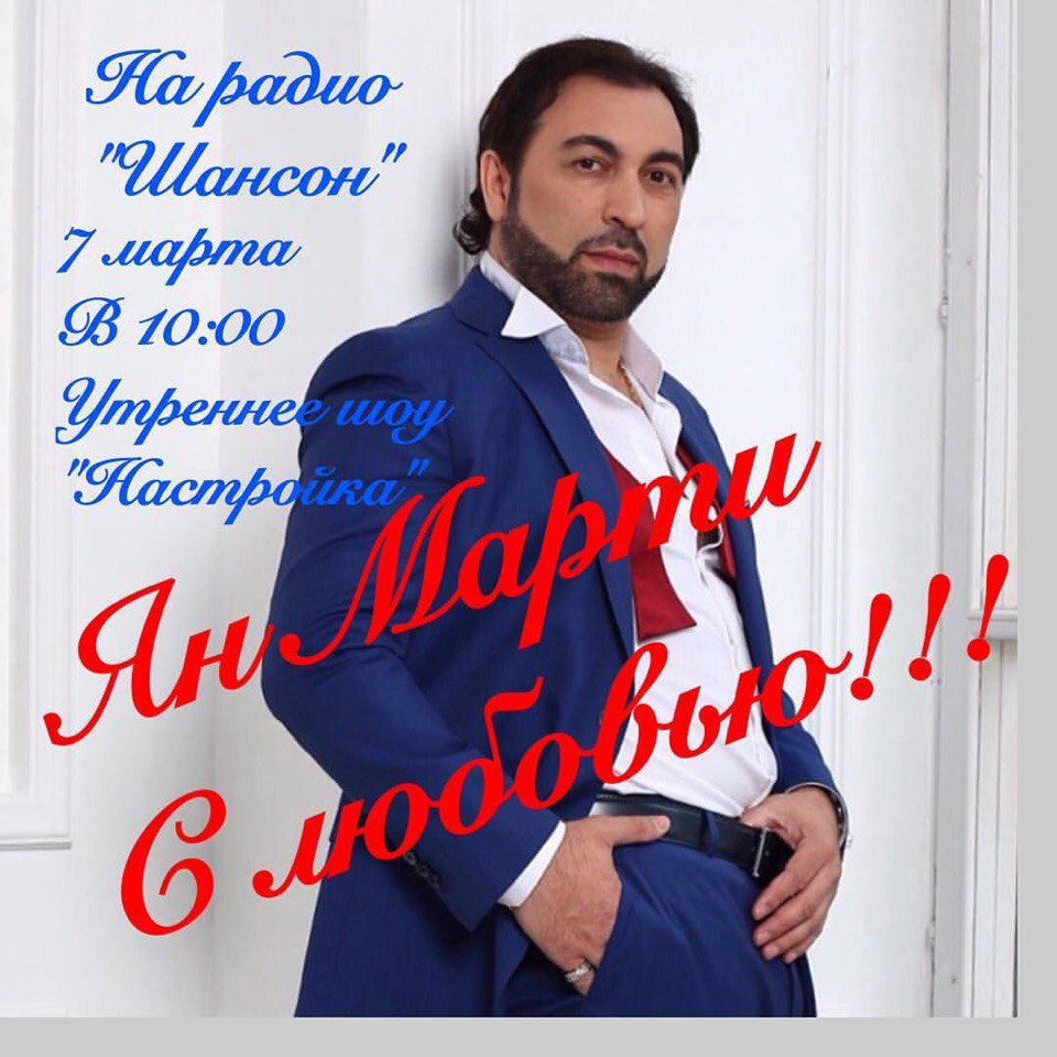 Прямой эфир на радио Шансон 7 марта в 10:00 в утреннем шоу "Настройка"! Слушайте и смотрите http://radioshanson.fm/program/nastroyka# Сюрприз от Яна Марти к 8 Марта.....#радиошансон #утреннеешоу #настройка #янмарти #прямойэфир #праздник #8марта #онакрасива #россия #москва #певец #концерт #премьера #премьерапесни #хит #любимыеженщины #