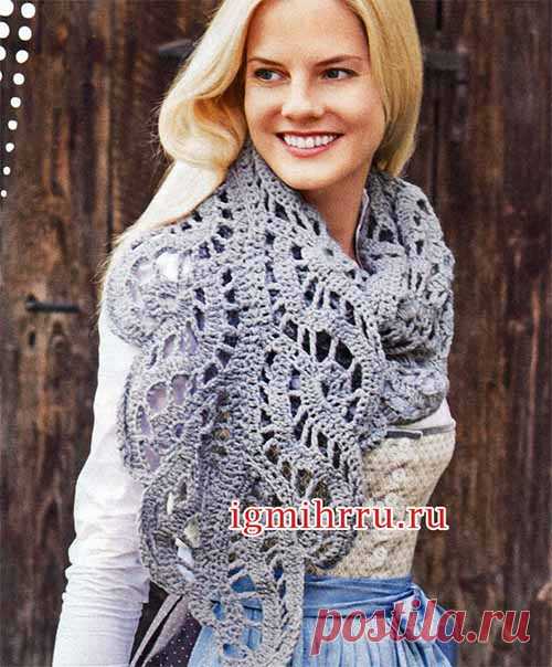 Необычная ажурная шаль Размеры: 35 x 180 см Вам потребуется: 6 мотков серой пряжи Schachenmayr Wool (100% шерсти, 85 м/50 г); крючок № 6. Техника вязания Мотив: вязать по схеме прямыми и обратными рядами. Начинать с 3 воз…
