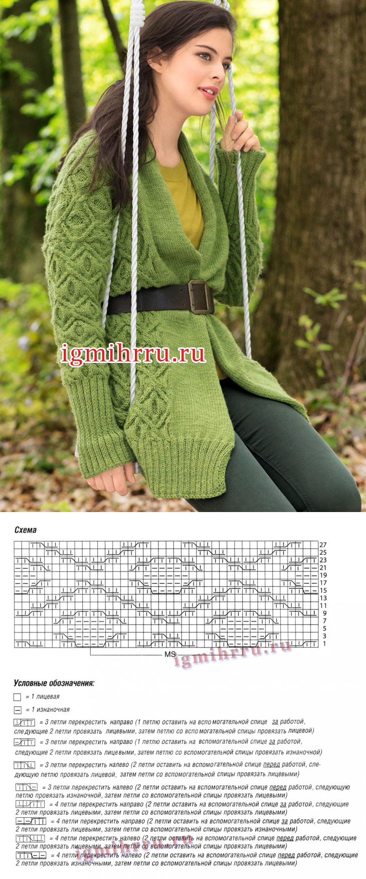 Зеленый шерстяной жакет с выразительным узором из ромбов. Вязание спицами