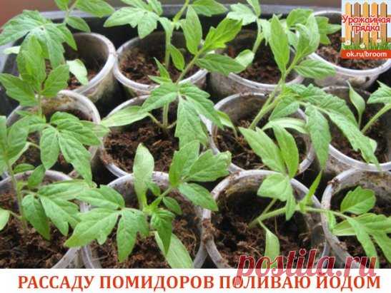 Раствор - одна капля йода на три литра воды, этим йодным раствором надо один раз полить рассаду томатов. От этого увеличиться продуктивность и будут побольше плоды.