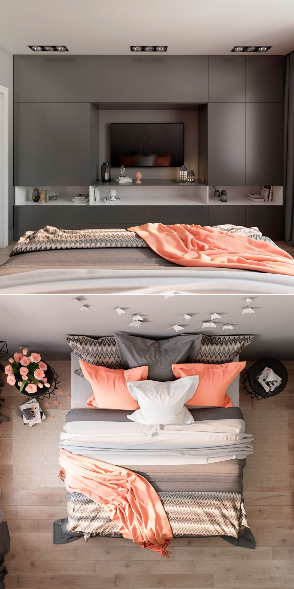 Нежная спальня в серых тонах с акцентами кораллового цвета - Дизайн интерьеров | Идеи вашего дома | Lodgers