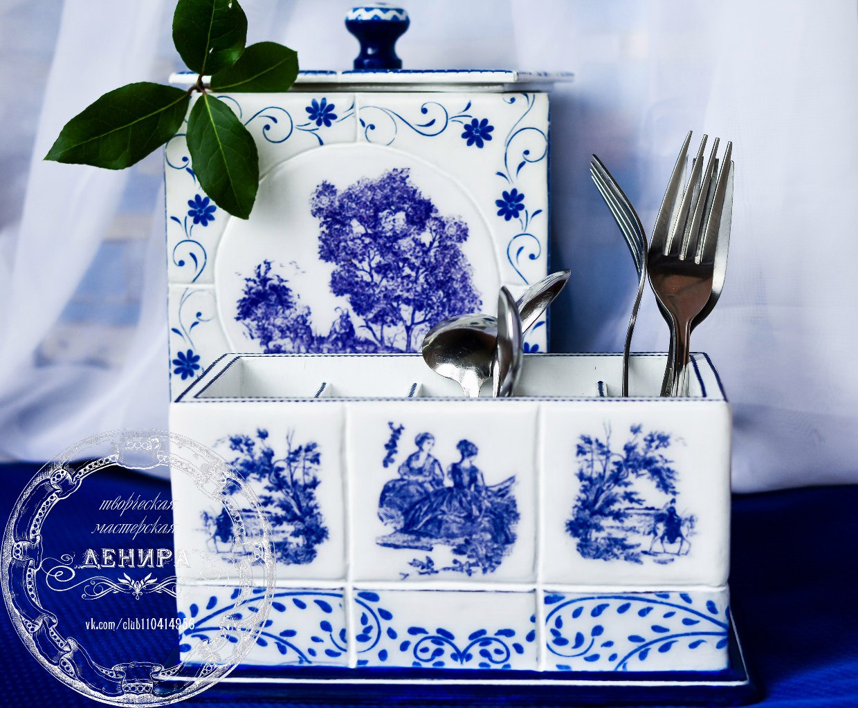 кухонный набор в сине-белой гамме с элементами Туль де жуи : короб под сыпучие "Галантный пастушок" и подставка под столовые приборы "Наездницы"