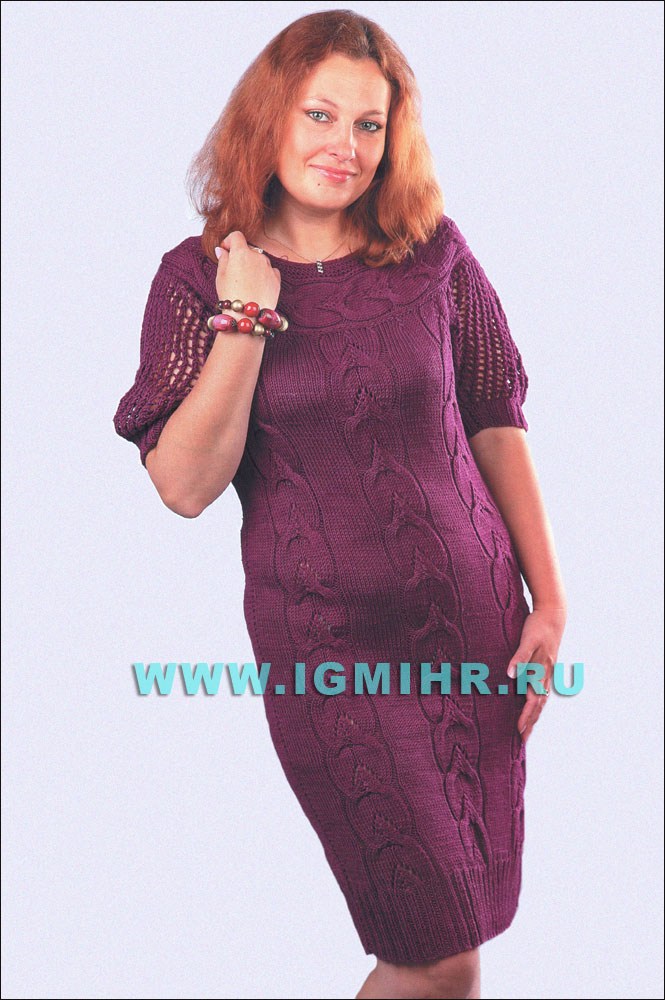 Вишневое платье с короткими рукавами и узорами из кос для пышной дамы. Спицы