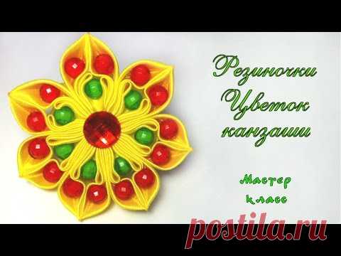 Резиночка Цветок канзаши из атласных лент и бусин своими руками. Elastic flower kanzashi with beads - YouTube