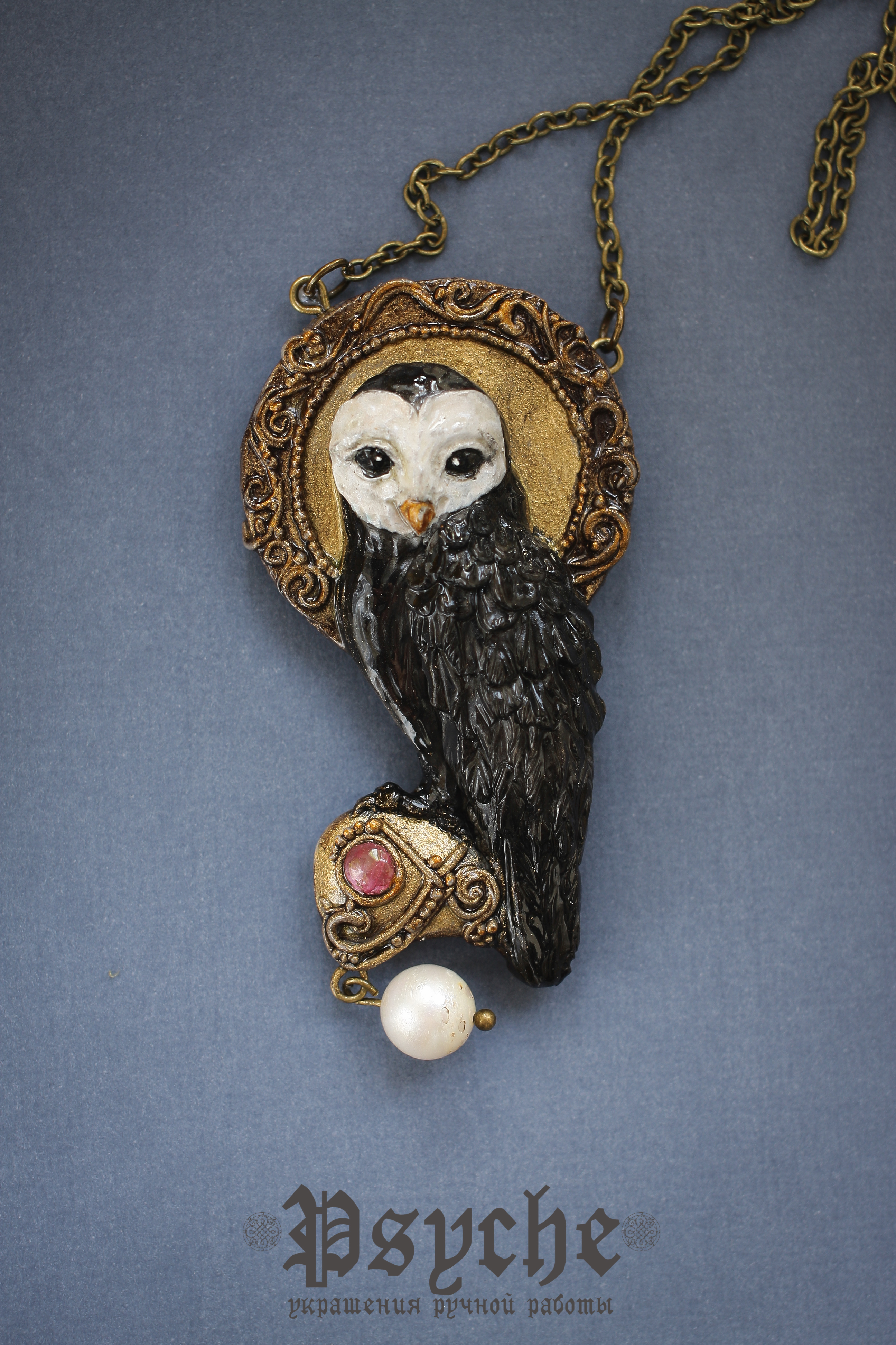 Черная сова сипуха. Кулон из полимерной глины, сделан в стиле миниатюра и филигрань. В подставке, на которой сидит сова, вставлен камень розовый топаз, снизу висит жемчуг. Фурнитура под бронзу. Общий размер 8 на 4 см. Цена 2000 р.