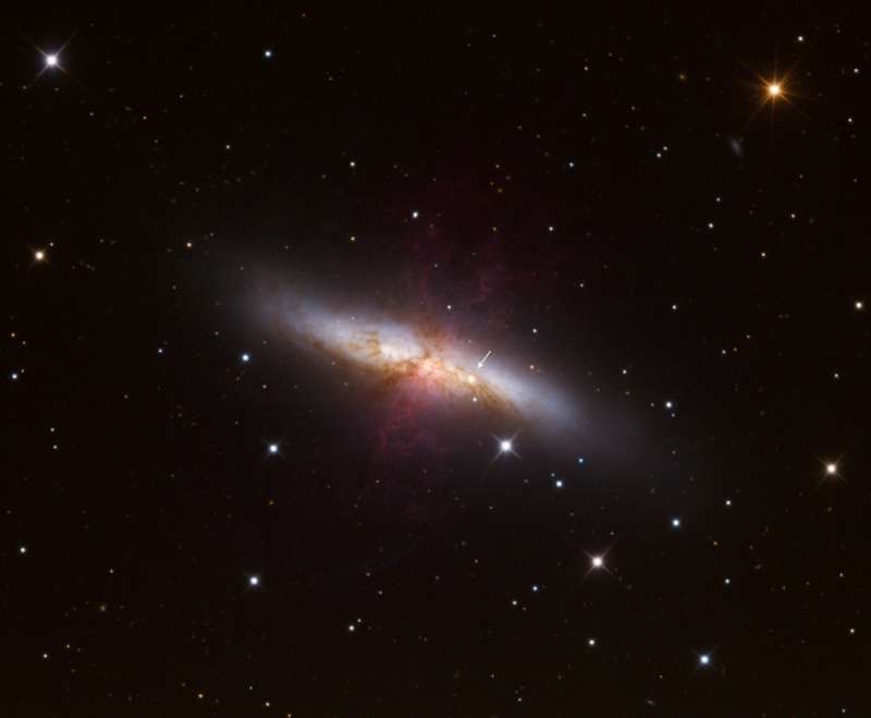 В действительности астрономы никогда не ищут сверхновые по стрелочкам на картинке. Но на этой фотографии, сделанной 23 января этого года, стрелочка и вправду указывает на реальную сверхновую, вспыхнувшую недавно в яркой галактике M82 и записанную в каталог под номером SN 2014J. Галактику M82, расположенную рядом с Большим Ковшом на небе Земли, ещё называют галактикой Сигара. Это довольно популярный объект для наблюдения в небольшие телескопы северного полушария.
