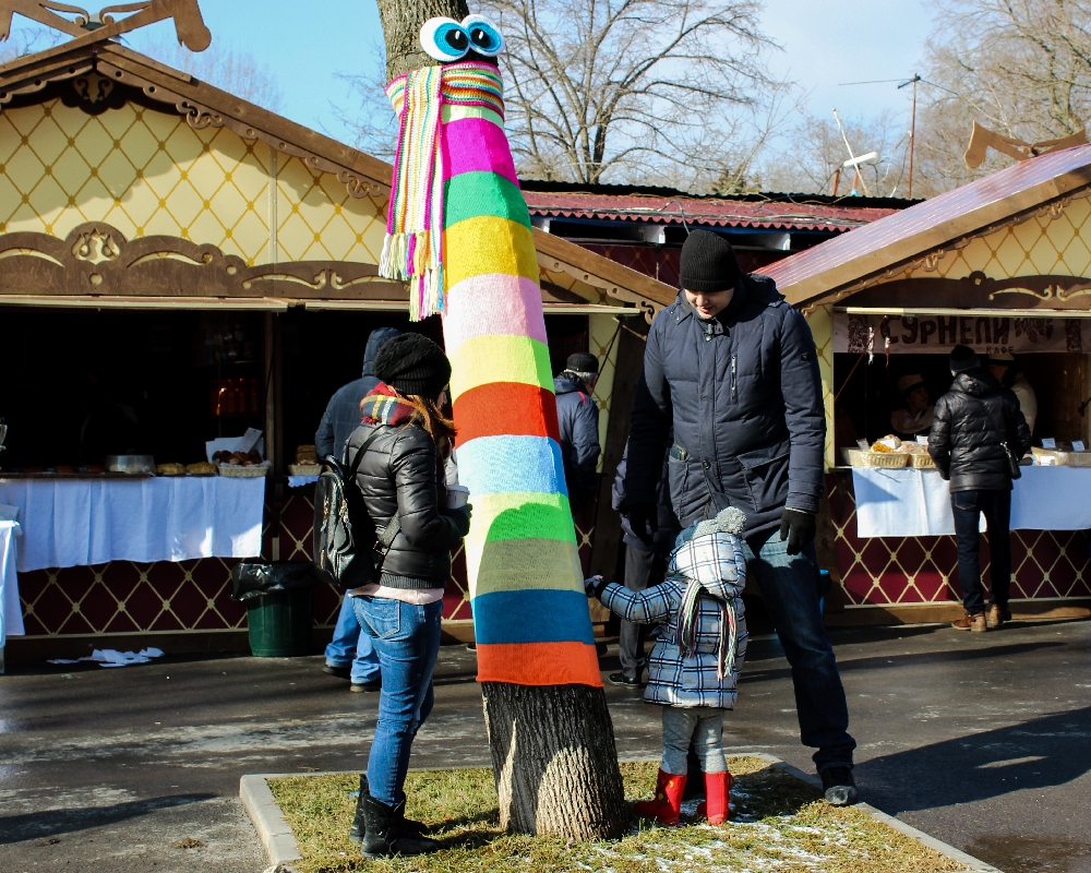 Ярнбомбинг (yarnbombing) – граффити из пряжи, вязаная «одежда» для деревьев и других элементов городского ландшафта. Ярнбомбинг подходит и для домашнего декора, он поможет создать необычный, яркий и в тоже время уютный образ. Пряжа для него лучше всего подходит акриловая, она яркая, прочная, не скатывается и не линяет. Данная работа выполнена с использованием машинной вязки, отдельные элементы выполнены вручную (вязание крючком). Можно выполнить ажурную вязку крючком из мотивов. Работа выполняет