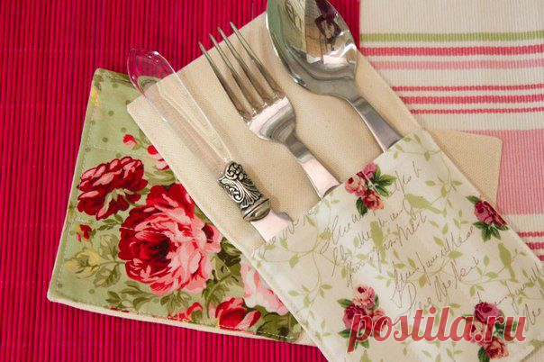 Куверты (конверты или чехлы для столовых приборов) являются неотъемлемой частью сервировки. Они выглядят эстетично и придают элегантность оформлению праздничного стола. Можно выполнить куверты из ткани любого цвета, украсить дополнительно декоративной тесьмой или вышивкой, вышить фирменный логотип.