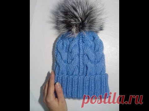 Шапка со жгутами. Шапка спицами и меховым помпоном. Мастер класс.Вязание спицами.