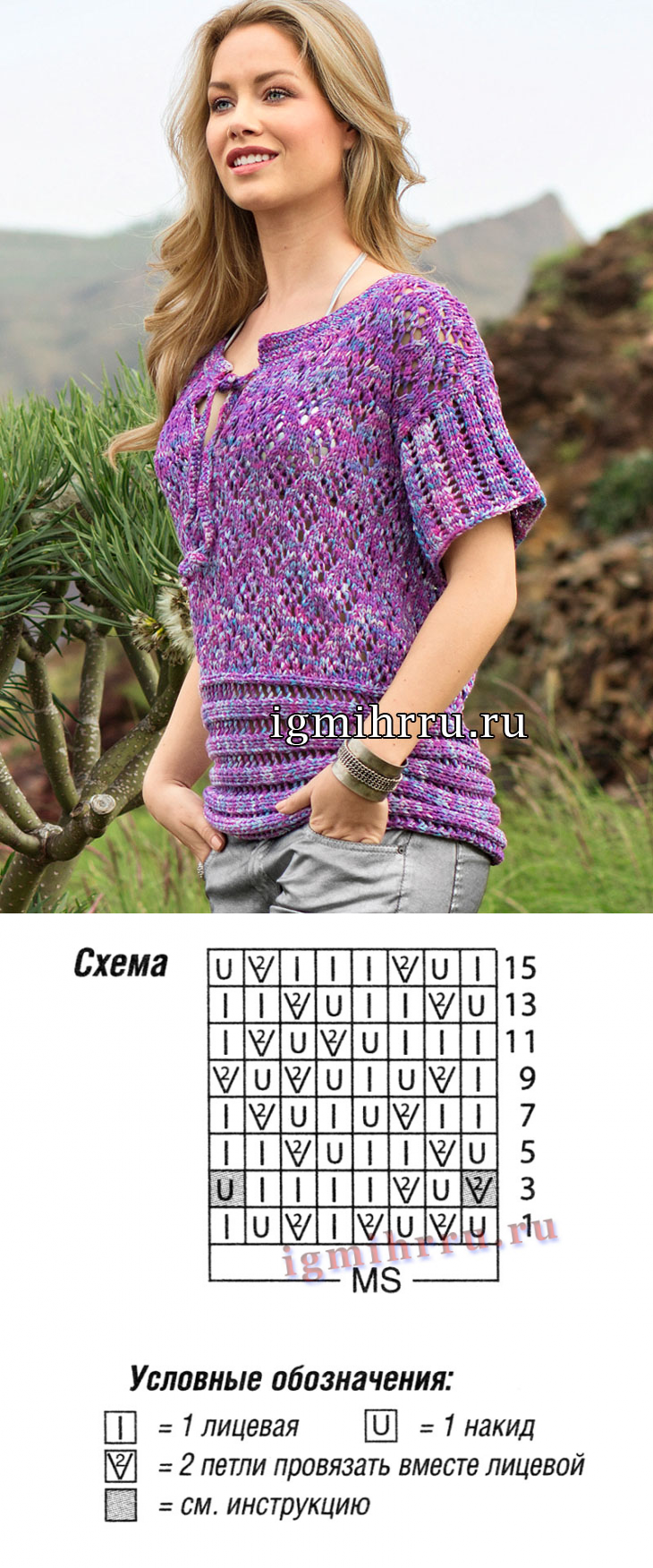 Лилово-розовый меланжевый пуловер со связанной поперек планкой. Вязание спицами
