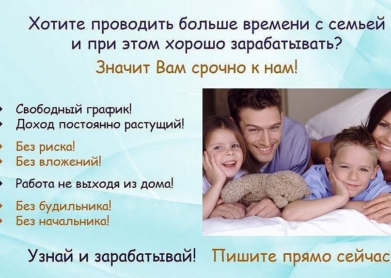 Здравствуйте, мы предлагаем работу сидя дома на диване по 2 - 3 часа в день за ПК или любым другим гаджетом с которого можно выйти в интернет. Окладом от 20т. до 200т. Руб. (3000$)вакансии от менеджера до директора все зависит от вас как вы будите работать. Без риска, без вложений. Все официально. Плюс у нас есть премии, тур поездки оплачиваемые фирмой и много разных бонусов.