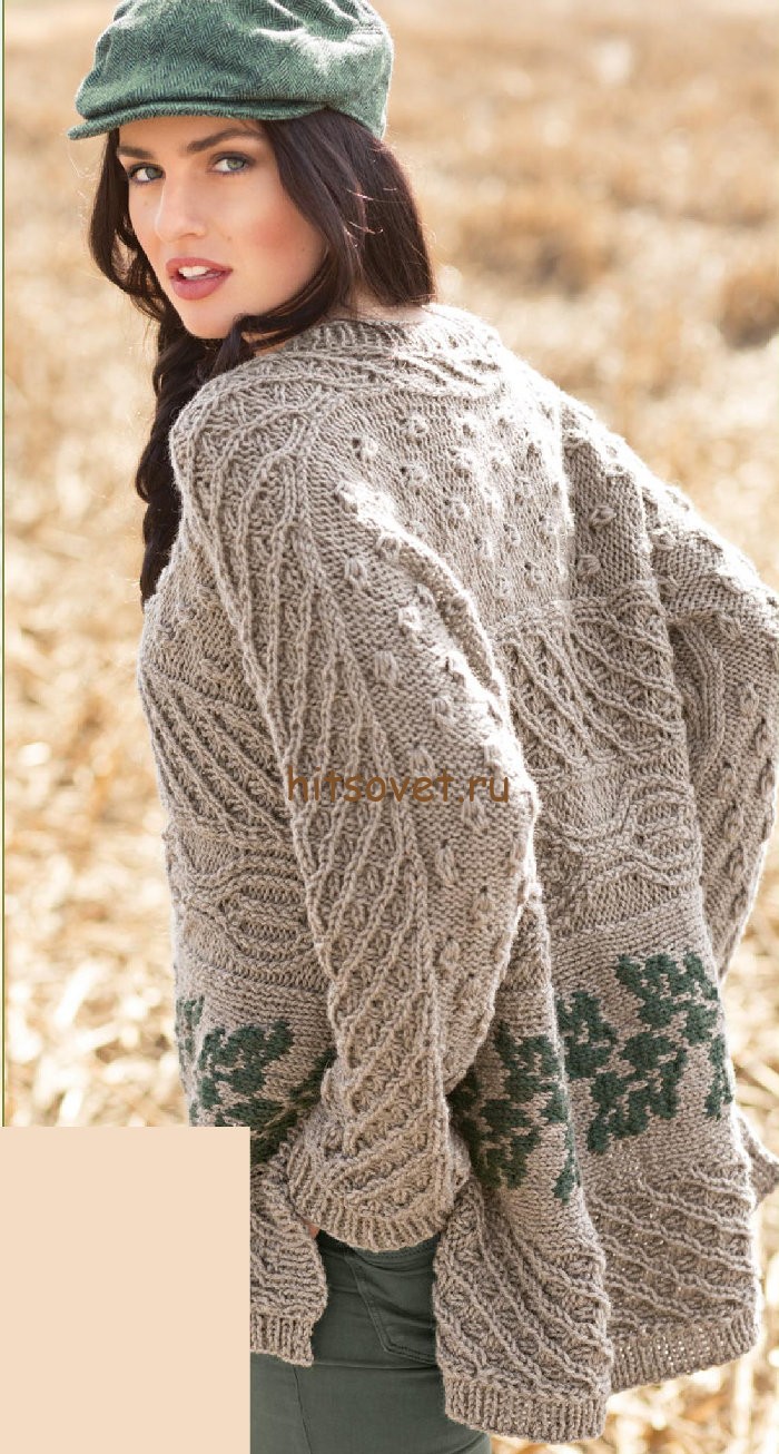 Свободный пуловер с аранами - Хитсовет Свободный пуловер с аранами. Модная модель женского свободного пуловера с аранами со схемами и бесплатным описанием вязания. Вам потребуется: 800 грамм болотной и 100 грамм зеленой пряжа, состоящей из 100% натуральной шерсти; длиной нити 150 метров в 50 граммах; круговые спицы № 5,5.
