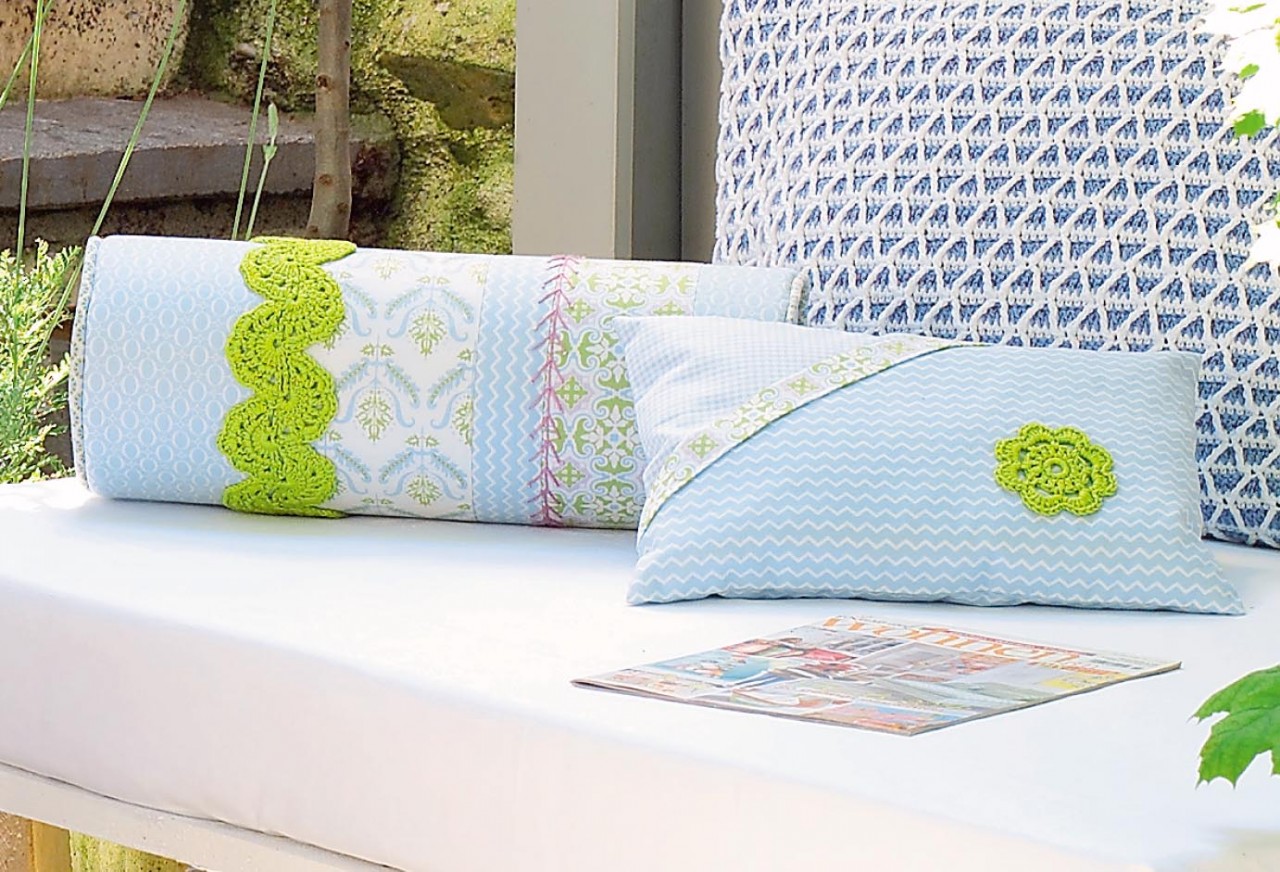 Диванные подушки с вязаным декором. Описание Валик и небольшая подушка сшиты из тканей-компаньонов и украшены декоративными элементами, связанными крючком. Просто и оригинально!