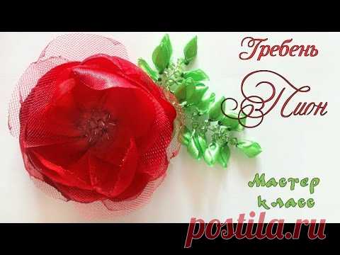 Гребень Пион в прическу на выпускной из атласных лент, органзы, фатина веточкой из бусин. Peony comb - YouTube