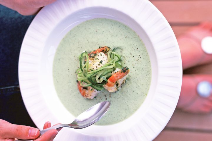 Chilled cucumber soup with garlic prawns
