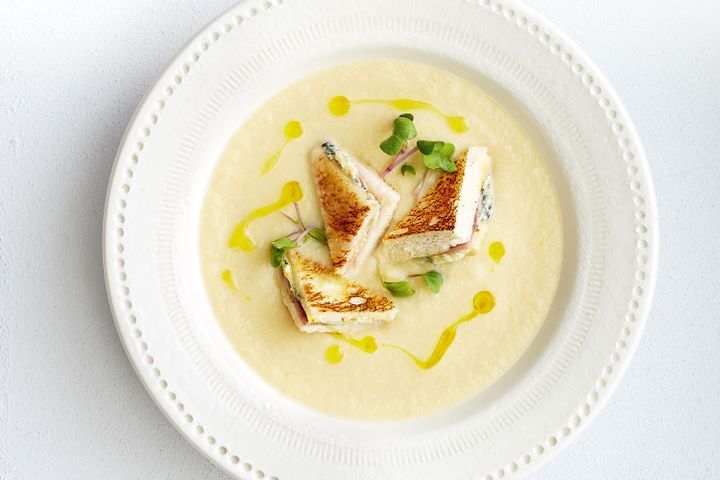 Cauliflower soup with blue cheese and ham sandwich croutons