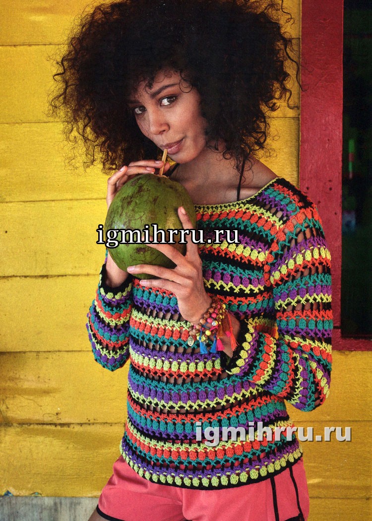 Пестрый летний пуловер из хлопковой пряжи. Вязание крючком