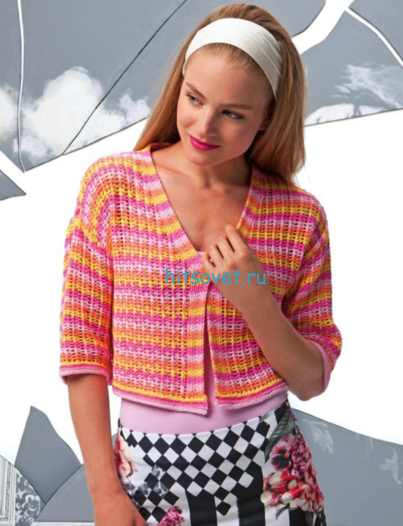 Женский вязаный жакет с ажуром - Хитсовет Женский вязаный жакет с ажуром. Вам потребуется: пряжа LANG YARNS BABY COTTON (чесаный биохлопок) по 100/150/150/200 г = 2/3/3/4 мотков бледно-розового 112.0009, ярко-розового 112.0019, желтого 112.0014 и оранжевого 112.0028. LANG YARNS, спицы № 2,5 и № 3. 1 пуговица.