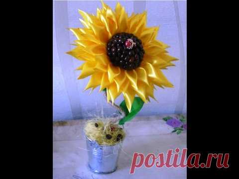 Подсолнух из кофе и атласных лент, видео мастер-класс