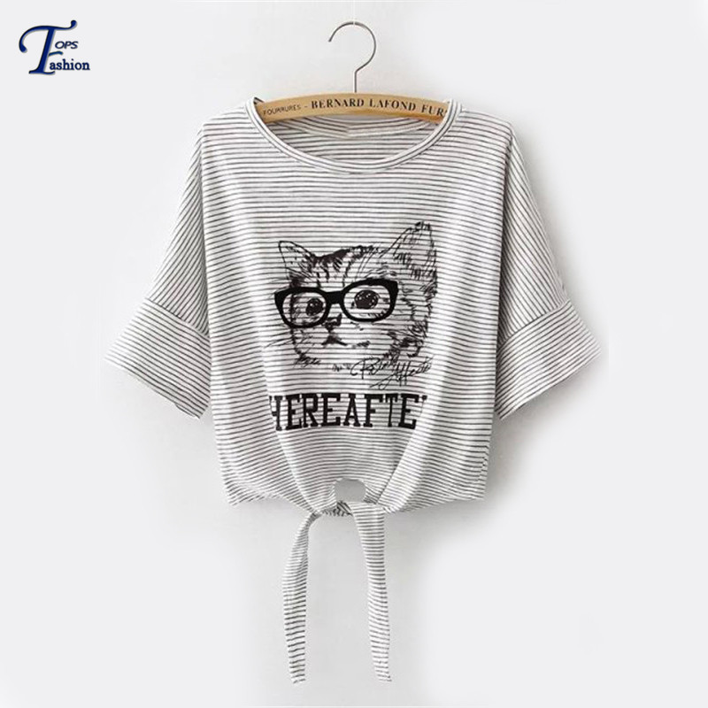Женщины летний новый горячий милый корейски тис серый свободного покроя полосатый кот печатных завязывают с коротким рукавом шею кадрированные футболки купить на AliExpress