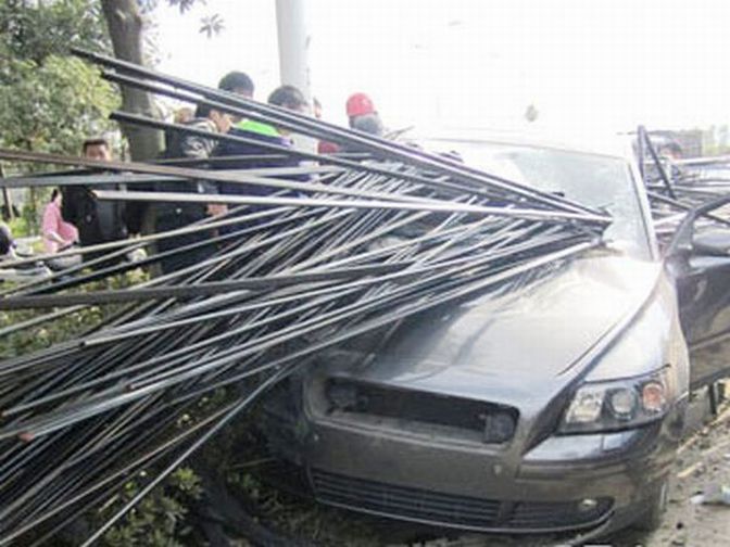 Везучий водитель (4 фото) | Чёрт побери Жуткая авария на трассе. Последнее что помнит водитель - куча металлических штырей, которые летят в него. Удивительно - но он выжил. Как? Никто незнает. Чудо!