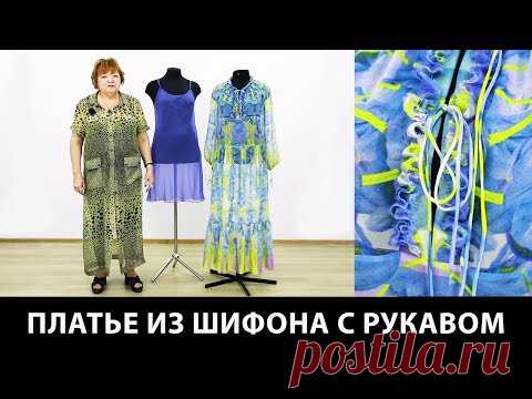 Модель длинного летнего платья из шифона с оборками и рукавами в комплекте с нижним платьем