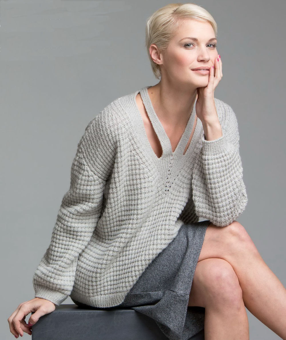 Модный оверсайз спицами с необычным оформлением выреза горловины