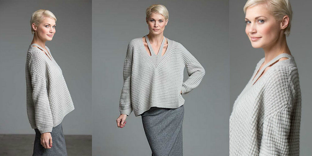 Модный оверсайз спицами с необычным оформлением выреза горловины