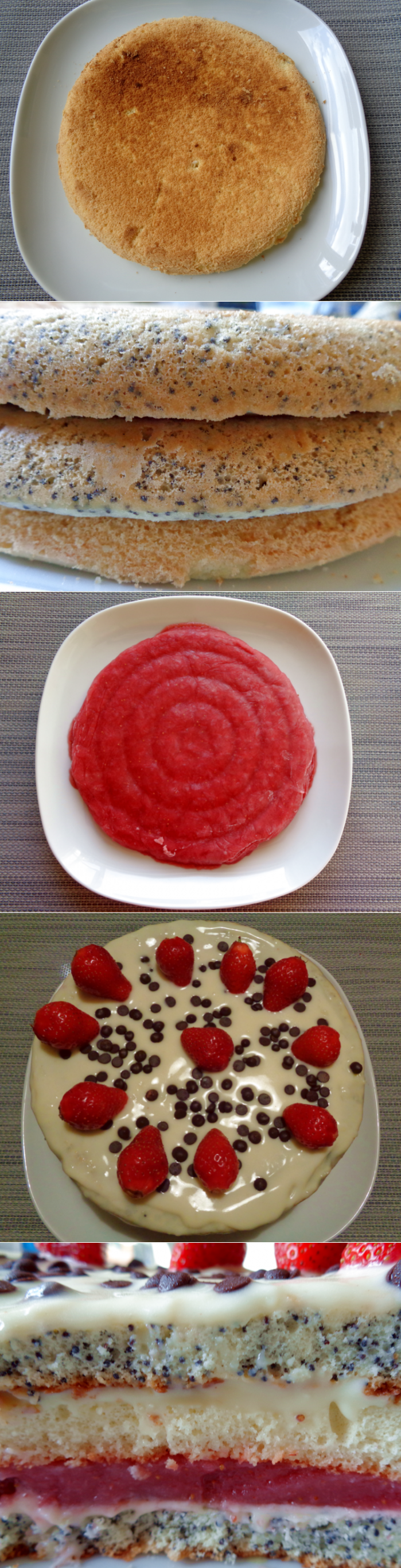 Торт «Клубничный поцелуй». = мука, 7 ст. л. сахар, 9 ст. л. яйцо, 6 штук желток, 2 штук мак, 4 ст. л. молоко, 400 мл сахарная пудра, 4 ст. л. крахмал, 3 ст. л. сливочное масло, 250 грамм ваниль, 1 щепот. клубника, 500 грамм желатин, 1 ст. л.