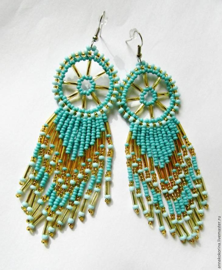 Плетем серьги из бисера Сегодня автор расскажет, как сплести простые сережки «Ловец снов». Нам понадобится: — бисер № 10 двух цветов;— бисер № 8 один цвет;— стеклярус 6 мм;— швензы;— нитки, ножницы, игла.Ряд № 1. Закрепляем ...