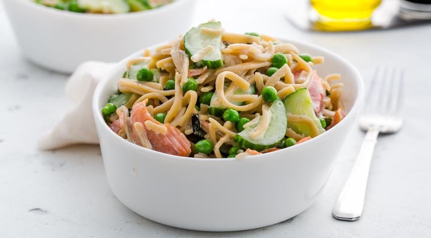 Салат из бобовой лапши с копченым лососем, горошком, сливочным сыром, огурцом и мятой, пошаговый рецепт с фото