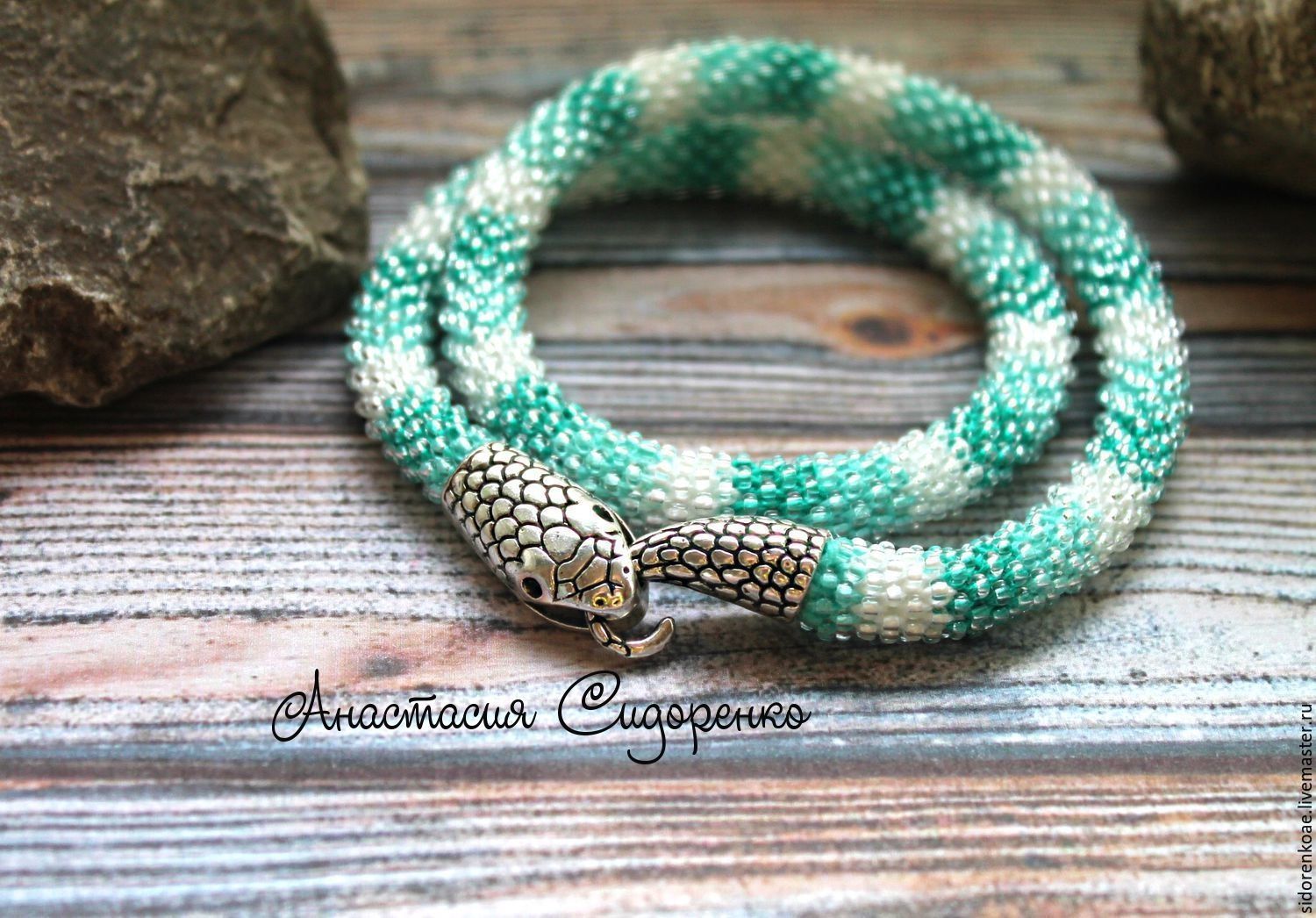 Жгут из бисера тонкие змейки универсальные чокер-браслет Купить или заказать Жгут из бисера тонкие змейки универсальные чокер-браслет в интернет-магазине на Ярмарке Мастеров. Универсальное украшение чоке-браслет связано из прозрачного чешского бисера на секционно-окрашенной пряже.Длина вместе с застежкой 44см, длину можно регулировать за счет перекручивания браслета. Также по вашему желанию я могу уменьшить длину браслета (бесплатно) застежка ввиде головы и хвостика змеи. ...