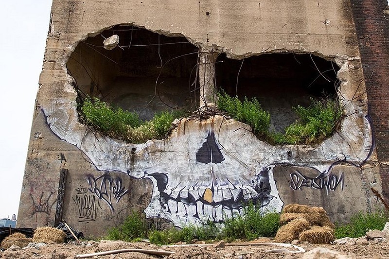 Дьявольский череп. Он на вас смотрит | Чёрт побери Художник Greg (ака Suitswon ) создал этот череп в Гринпоинте, Нью - Йорке, гигантские дыры работают отлично , как огромные глазницы. Дьявольский череп….. Впечатление и жутковатое, и завораживающее.