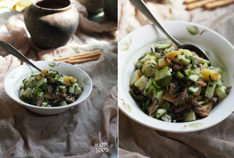 Картофельный салат с грибами и огурцом Предлагаю римейк старого, простого проверенного годами рецепта сытного салатика - на обед идет как песня!)): на 4 порции 300 гр шампиньонов 300 гр картофеля пучок зелени 2 зубчика чеснока 1 красная луковка 2 огурца бальзамик- 20 мл лавровый лист 2 шт розмарин оливковое масло 50 мл растительное…