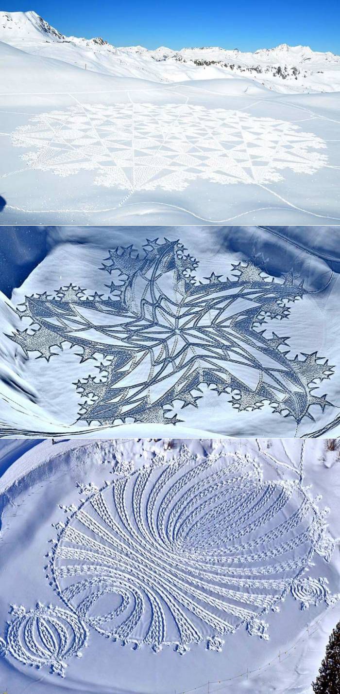 Снежные узоры от Саймона Бека. Британский художник Саймон Бек создает потрясающие геометрические узоры на снегу, шагая по нему в своих специальных снегоступах.Для того чтобы фигуры получались геометрически точные Саймон использует обычный ручной компас, а иногда использует нитку,которую прикрепляет в центре, для создания кругов. На каждый такой неповторимый снежный узор он тратит около 10 часов.