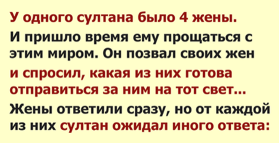 Притча «О четырех женах» - Part 2 Жил был султан, у которого было 4 жены. Все они были умницами и красавицами, но больше всего он любил четвертую – молодую, добрую и ласковую. Мужчина одевал ее в дорогие платья, дарил драгоценности и всячески баловал. Без ума он был и от третьей жены – самой красивой женщины на земле. Султан всегда брал ее с собой, когда ехал в другие страны, чтобы все видели ее красоту. Но при этом он очень боялся, что она когда-нибудь уйдет от него к дру...
