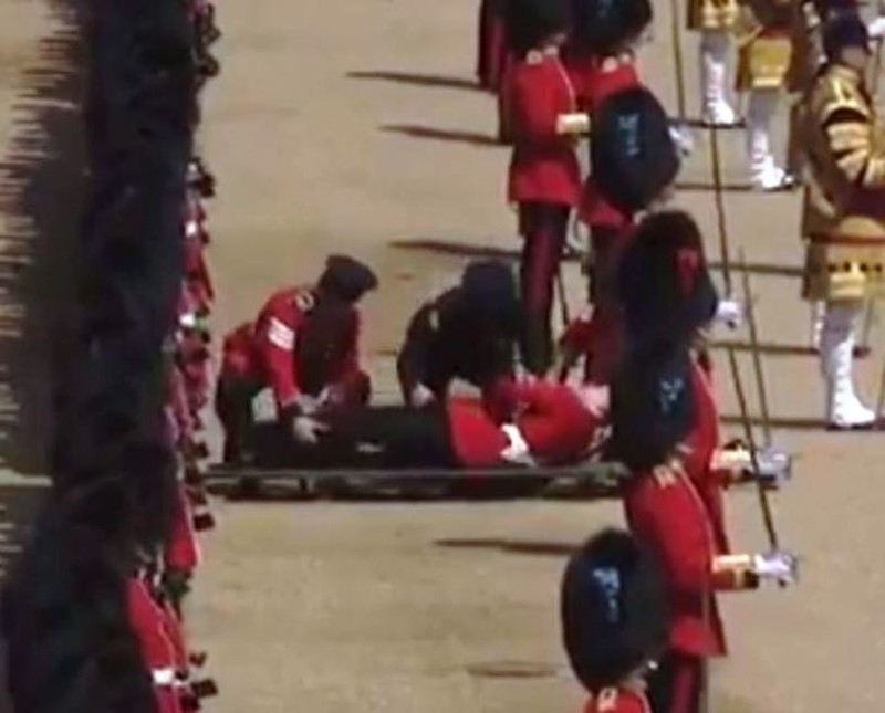 На дне рождения Елизаветы II произошел массовый обморок гвардейцев (4 фото) | Чёрт побери Пять гвардейцев упали в обморок в Лондоне на торжественном параде, посвященном официальному дню рождения королевы Елизаветы II. В Великобритании во время парада, посвященного официальному дню рождения королевы Елизаветы II, несколько гвардейцев потеряли сознание. На фотографиях, размещенных в Твиттере британскими СМИ, видно, как один из гвардейцев лежит на асфальте, а другого уносят н...