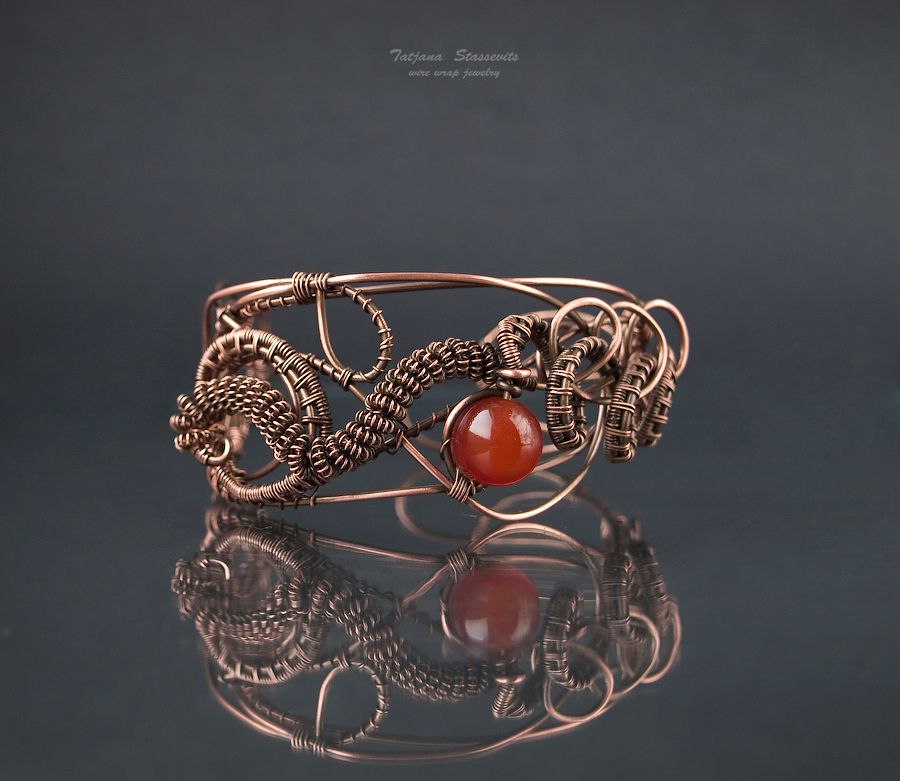 Wire Work браслет медный с сердоликом. Сердолик помогает понять и осознать, как найти свое уникальное место в жизни и как применить свои силы в физическом мире.
