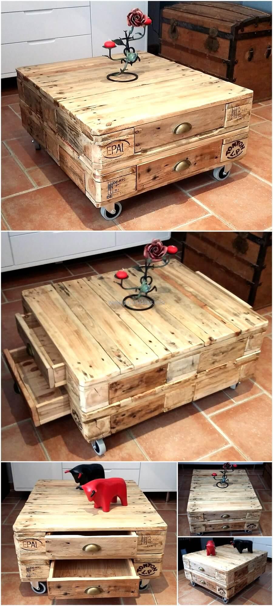 Little Pallets Coffee Table on Wheels with Drawers | Pallet Ideas