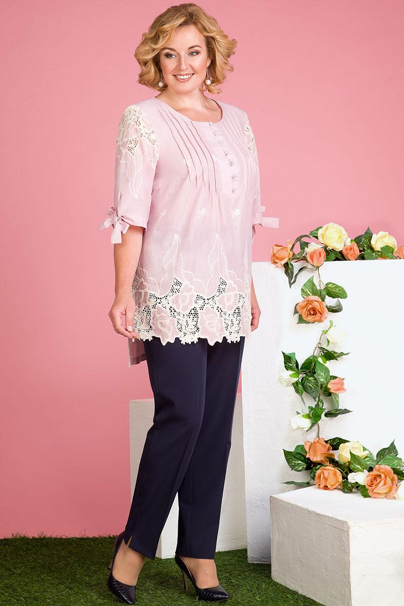 Костюм Лилиана, лиловый+темно-синий (модель 568В) — Белорусский трикотаж в интернет-магазине «Швейная традиция» Длина: по спинке – 82 см, перед – 74; рукав – 36 см. Дополнительное описание: Стильная летняя туника из хлопковой ткани с кружевом. Модель с округлым вырезом горловины, с застежкой на планки с навесными пуговками в виде кристаллов. По полочке застрочены декоративные защипы. Рука втачной, средней длины с притачной манжетой, концы которой, можно завязать на бант....
