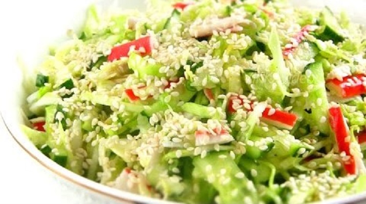 Божественно вкусный салат со свежей капустой, крабовыми палочками и свежим огурцом обязательно найдет своих поклонников за вашим столом. Это тот вариант салата, когда хочется поставить на стол что-то вкусненькое и необычное, но нет ни сил, ни времени для кулинарных шедевров.